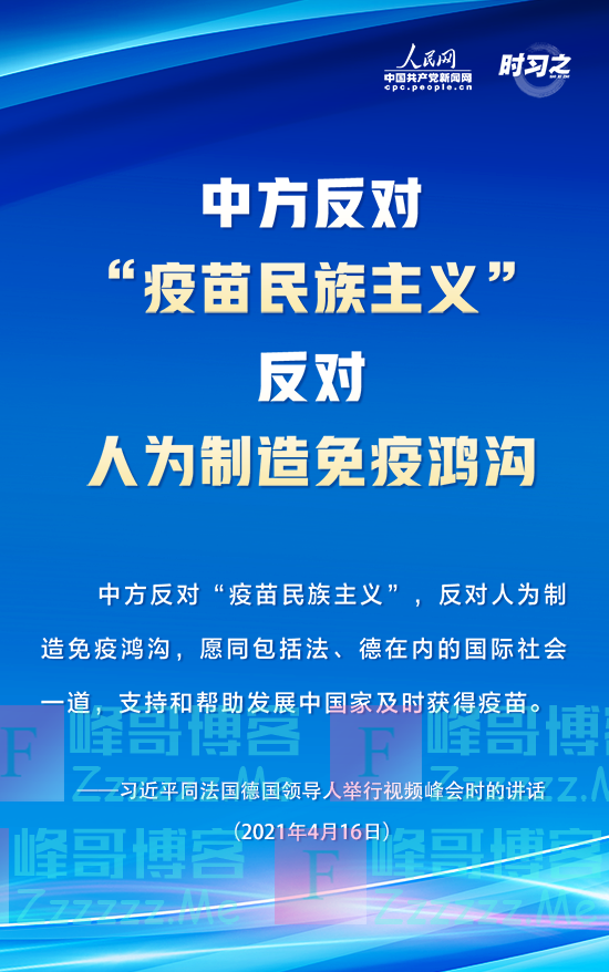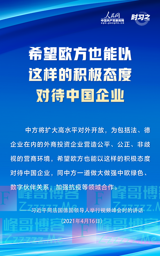 【编者按】 4月16日下午,国家主席习近平在北京同法国总统马克龙、德国总理默克尔举行中法德领导人视频峰会。三国领导人就合作应对气候变化、中欧关系、抗疫合作以及重大国际和地区问题深入交换意见。人民网·中国共产党新闻网“时习之”栏目摘录了习近平在这次视频峰会上的重要讲话内容,一起学习。