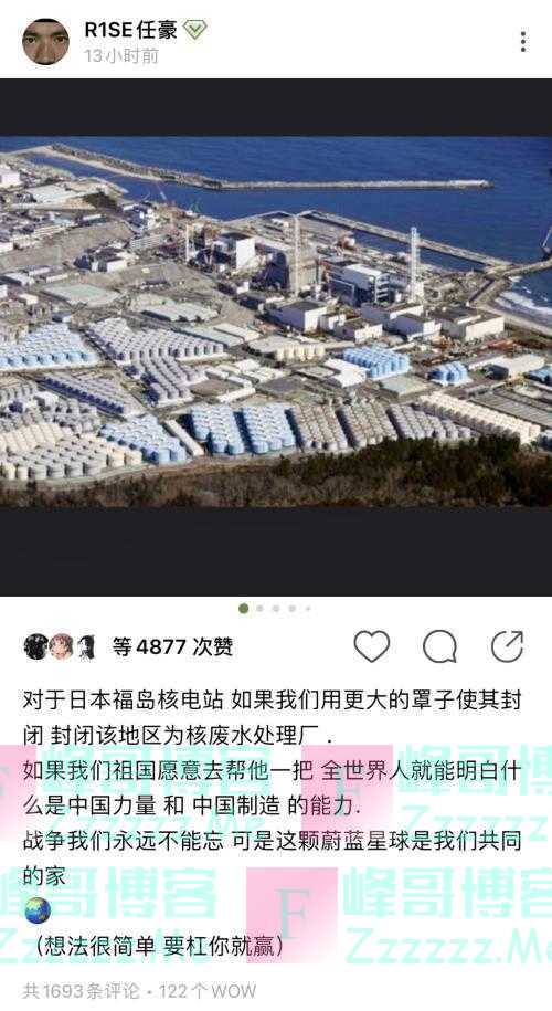 此前,4月14日17时59分,任豪在绿洲发布动态并同步至微博:“对于日本福岛核电站,如果我们用更大的罩子使其封闭,封闭该地区为核废水处理厂。如果我们祖国愿意去帮他一把,全世界人就能明白什么是中国力量和中国制造的能力。战争我们永远不能忘,可是这颗蔚蓝星球是我们共同的家。”