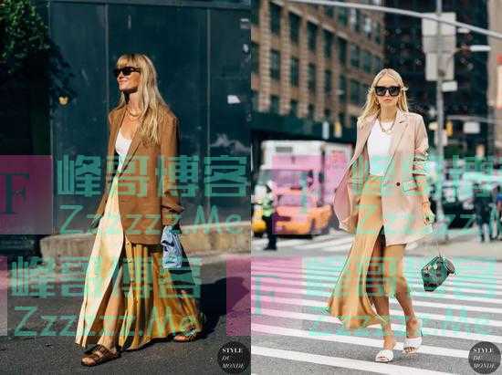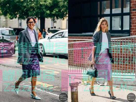 几乎完全相同配色的西装+半裙组合,廓形和面料一换,就从早春过度到了暖春;注意啦,内搭上衣也有讲究,宽领衬衫更通勤,白T恤则更休闲