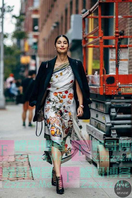 编辑最喜欢的Caroline Issa就很常穿,而且都要搭配夺人的印花连衣裙:尤其偏爱那条飘逸的不对称真丝印花裙,明媚浪漫极了,但加一件黑色廓形西装,就变成了可以穿进办公室的职场造型。