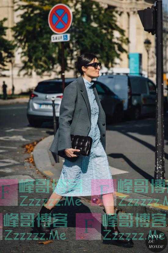 虽说现在流行“大女主”但也要穿得轻松一点,柔软一点。看看Irina Linovich的街拍 (她曾是乌克兰版《Vogue》的国际出版人) ,她用幼蓝色皱裙跟灰呢西装搭配,脚上一双Bottega Veneta Tire厚底切尔西靴,飒与嗲就都有了~