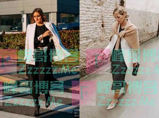 注意看,她们的鞋子也不一样,虽然都是尖头鞋,但Olivia的是老派名媛偏爱的尖头高跟靴,Anouk穿的是小精致的平底穆勒鞋。不知道你们更喜欢谁的穿搭呢?