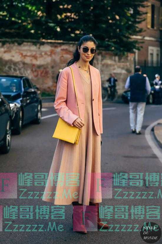 在编辑看来,纯色西装+连衣裙的搭配,最容易穿着美的就是顺色,即同色系搭配。稍高阶的则是近色系搭配,像前面灰色×浅蓝的冷调组合;还有一般人想不到的暖粉×暖驼的搭配,好特别好高级,不愧是我最爱的时装精,超会穿的!