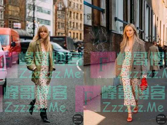 街拍里两人经常给自家牌子带货,比如这条美美的碎花连衣裙,一个搭配了格子西装,红色鞋包正好与衣服上的红色元素呼应,好看~Jeanette呢,穿的是橄榄绿色的软皮西装,好像给裙子上的花朵配上了藤蔓枝叶,因此整体看起来很和谐。