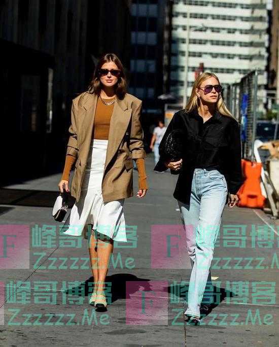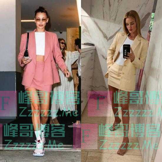 提到西装+迷你裙,编辑首先想到的是Hailey Bieber和Bella Hadid这对潮流小姐妹。宽外套与紧身裙的组合,很能凸显身材 (好身材和坏身材都被放大了),放到她俩身上绝对是正面的效果。