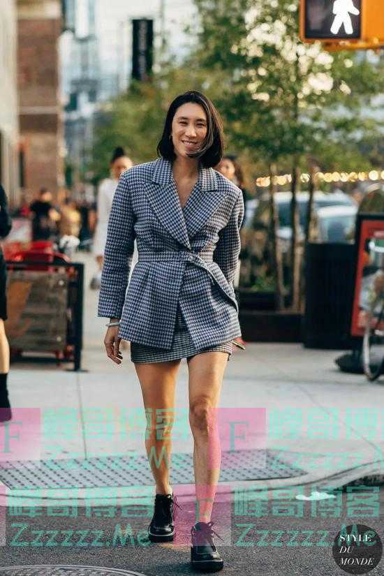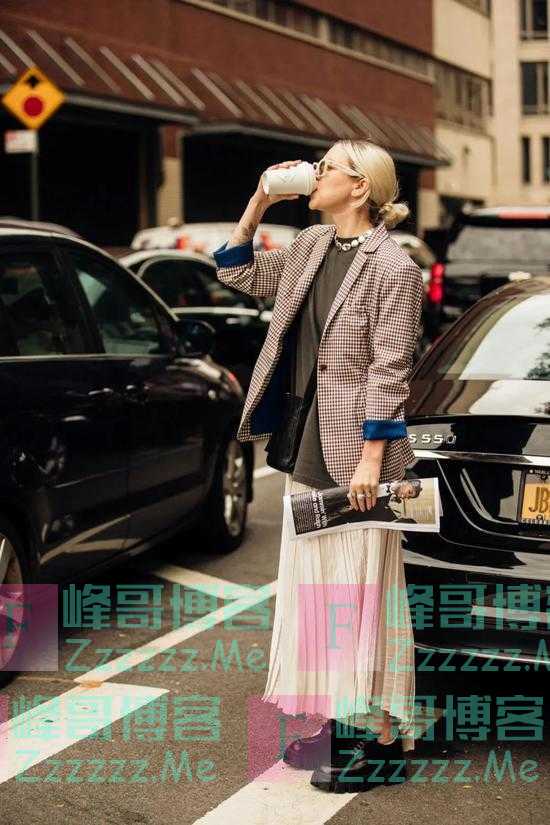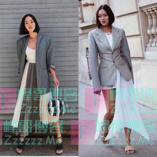 也可以换成灰白配!时尚买手Tiffany Hsu最喜欢这样穿,但她选的都是很有设计感的单品,比如箱型、沙漏型的廓形西装,搭配拼色款或不对称设计的褶裙,时髦指数很高。