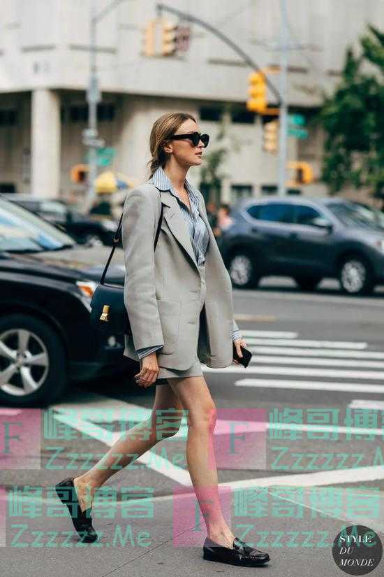 要是看腻了黑西装,灰色系的西服外套也蛮好。灰色本身是很显高级的冷调,常见思路是搭配黑色连衣裙和高跟鞋,穿的是独立女性的飒爽气质。