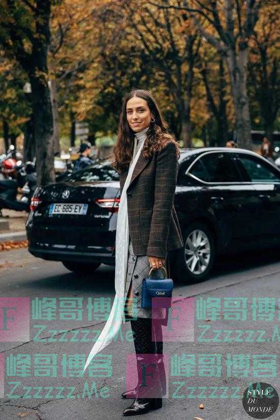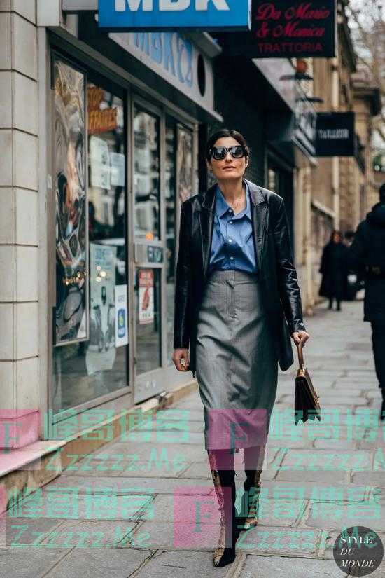 先来看看前面出现过的软皮黑西装,跟灰格铅笔裙和长靴的搭配很有职场感。比较特别的是内搭的蓝色绸衫,在灰黑之间特别抢眼,起到点睛的作用。