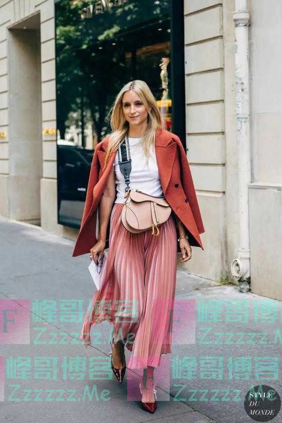 色彩一变,穿搭风格也随之改变。铁锈红的西装式呢外套,跟粉色半裙搭在一起竟然好美、好和谐。深红色尖头鞋和Dior的粉驼色马鞍包,与衣服的色彩呼应碰撞,喜欢明媚亮色的姑娘们不妨照着试一试。
