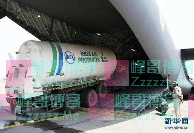 4月23日,在印度海德拉巴的贝贡佩特机场,一辆载着氧气罐的货车驶进印度军方的一架货机舱内。