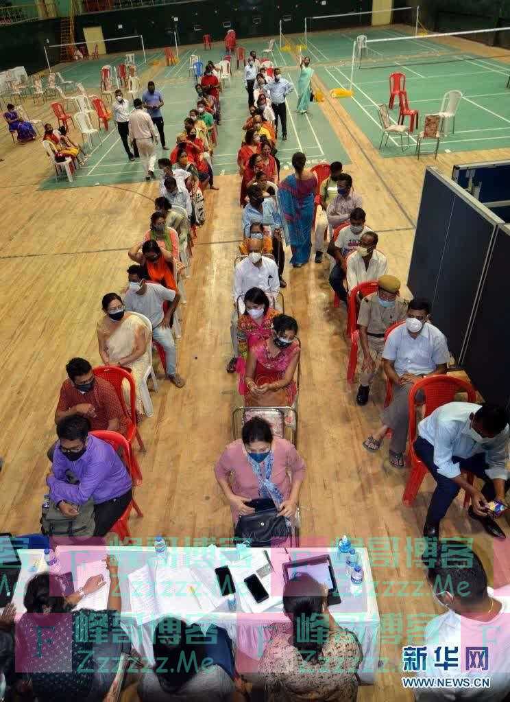 4月22日,居民在印度东北部城市高哈蒂的体育场排队接种新冠疫苗。