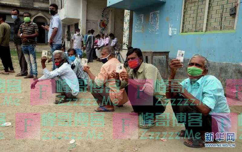 4月22日,人们戴着口罩在印度加尔各答郊区排队参加地方选举投票。