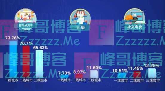 再来看不同类型城市的剁手选择,一线城市最爱在移动端App上购物,二、三线城市直播和社交电商剁手的比例则高于一线城市。