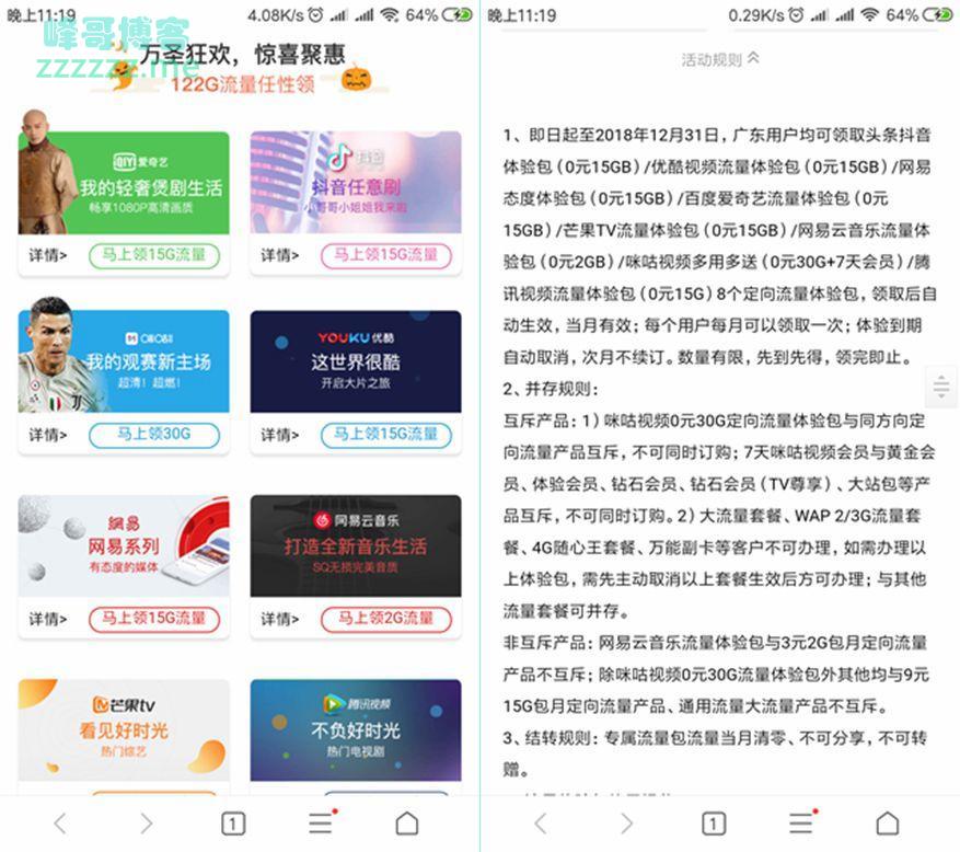 中国移动万圣狂欢活动免费领取122G定向流量》发布于2018-11-2
