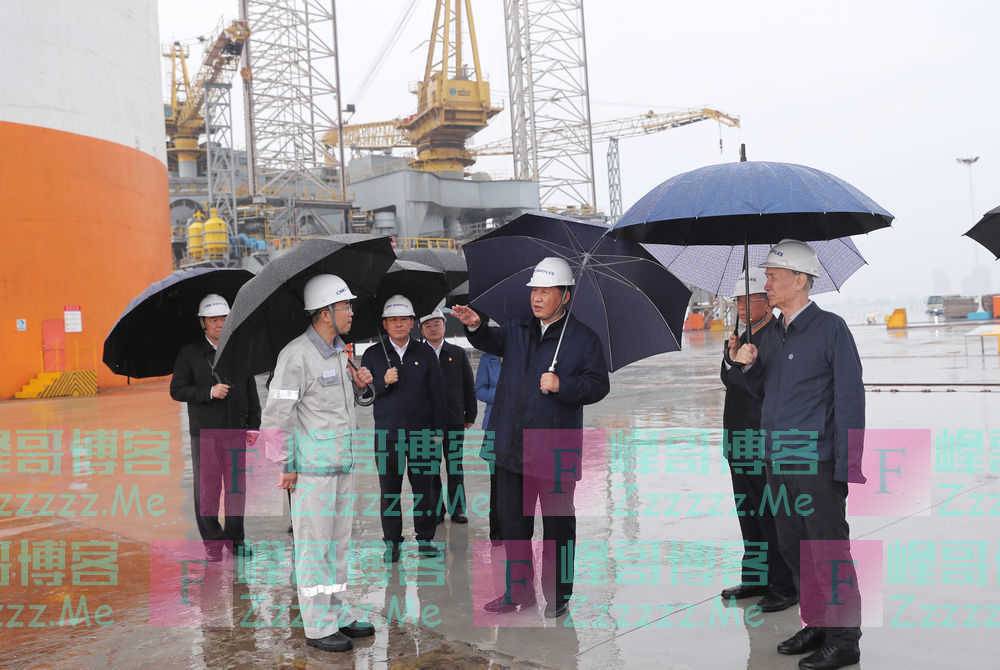 ↑2018年6月13日,习近平在山东烟台考察,冒雨来到中集来福士海洋工程有限公司烟台基地,视察海洋工程设备建设场地。