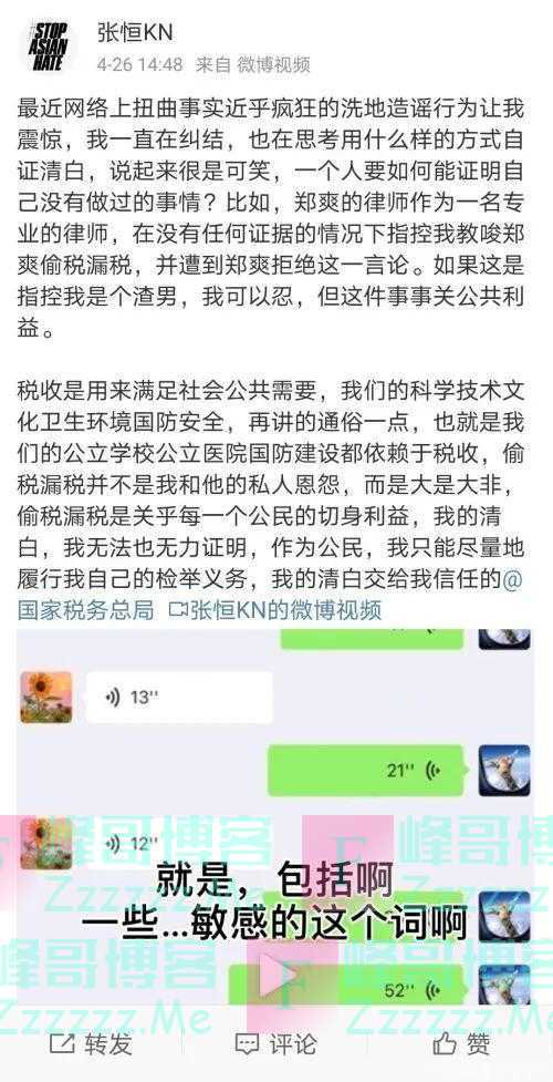 4月26日下午,张恒发微博驳斥此前网传其唆使郑爽逃漏税的传言,称郑爽方律师在没有任何证据的情况下提出了这一指控,“如果是指控我是个渣男,我可以忍,但这件事事关公共利益”。