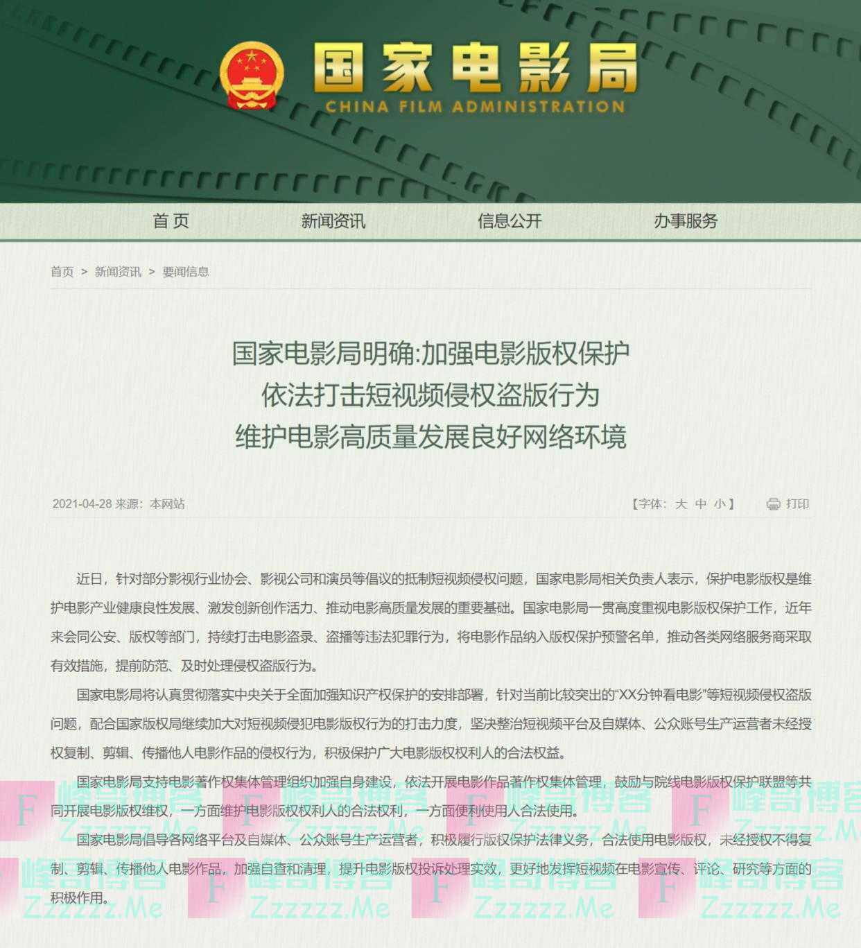 国家电影局网站4月28日消息,近日,针对部分影视行业协会、影视公司和演员等倡议的抵制短视频侵权问题,国家电影局相关负责人表示,保护电影版权是维护电影产业健康良性发展、激发创新创作活力、推动电影高质量发展的重要基础。国家电影局一贯高度重视电影版权保护工作,近年来会同公安、版权等部门,持续打击电影盗录、盗播等违法犯罪行为,将电影作品纳入版权保护预警名单,推动各类网络服务商采取有效措施,提前防范、及时处理侵权盗版行为。