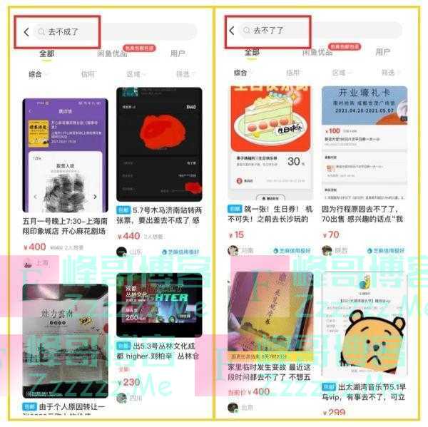 “五一”假期前夕,闲鱼上的“旅游商品”区突然热闹起来,8万人以“去不成了”“去不了了”为转让理由而发布转卖商品,其中包含演出、展览门票,餐厅自助餐甚至防晒霜、沙滩裙等旅游用品。