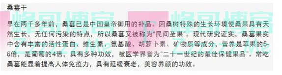 原文关于桑葚的营养描述,用了“是苹果的5-6倍,是葡萄的4倍”这样含糊的语句,对于桑葚干的营养则没有进行描述,更加没有提到桑葚干与补血的关系,又何来桑葚干补血一说呢?