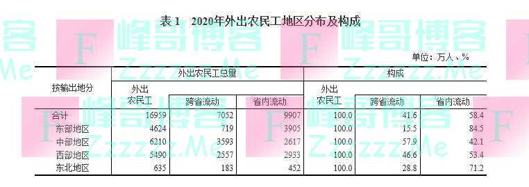 在外出农民工中,跨省流动农民工7052万人,比上年减少456万人,下降6.1%;在省内就业的外出农民工9907万人,比上年减少10万人,与上年基本持平。省内就业农民工占外出农民工的比重为58.4%,比上年提高1.5个百分点。分区域看,东部、中部、西部和东北地区省内就业农民工占外出农民工的比重分别比上年提高1.6、1.3、1.8和1.0个百分点。