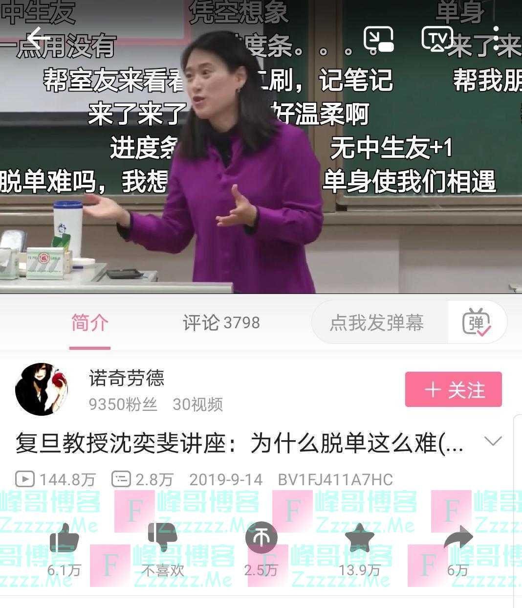 迅速攀升的播放量也曾让复旦社会学系副教授沈奕斐吃惊,在2019年,她的讲座《脱单为什么这么难》就被上传B站,时长近百分钟,点击量破百万。在2020年6月受邀入驻B站后,她成为一位时有爆款产出的UP主。