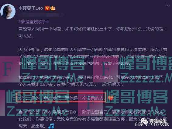 昨晚,李莎旻子在社交平台发文,配上自己在综艺节目中演唱歌曲的视频,自曝已经恋爱了,并称对方是一个温柔的人。
