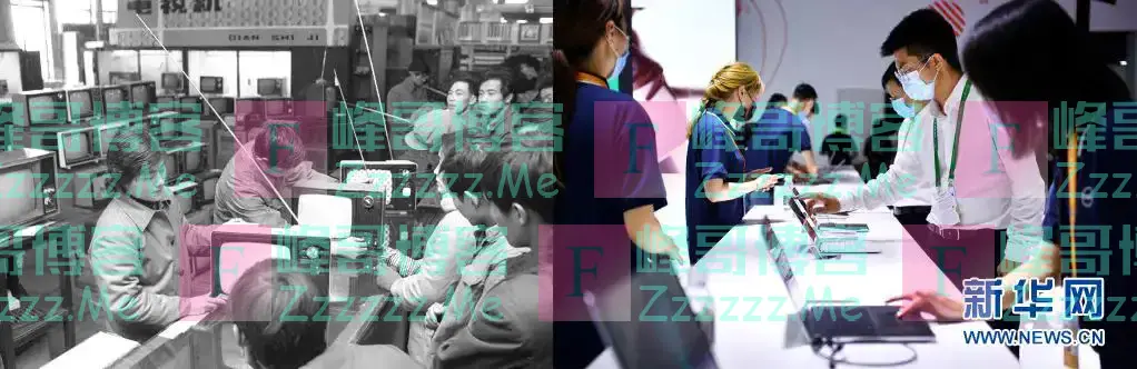 这是一张拼版照片:左图为1980年春节前夕,顾客在上海第一百货商店选购电视机(新华社记者张平摄);右图为2021年5月7日,观众在海南举行的首届中国国际消费品博览会旅居生活/消费服务展区选购电脑(新华社记者郭程摄)。新华社发