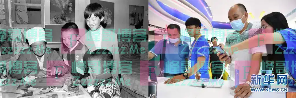 这是一张拼版照片:左图为1996年,在宁夏西吉县兴隆镇,靠加工牛百叶走上了富裕路的马雪玲(左一)和子女一起打电话向外地做生意的丈夫问好(新华社记者刘泉龙摄);右图为2021年5月8日,观众在海南举行的首届中国国际消费品博览会广东展区体验新款手机(新华社记者郭程摄)。新华社发
