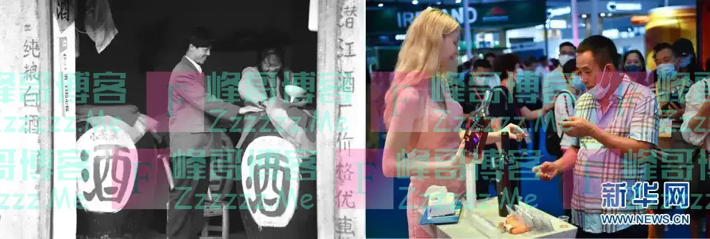 这是一张拼版照片:左图为1998年,顾客在湖北秭归新开张的一家白酒店买酒(新华社发,刘继伍摄);右图为2021年5月8日,观众(右)在海南举行的首届中国国际消费品博览会高端食品保健品展区品尝洋酒(新华社记者郭程摄)。新华社发