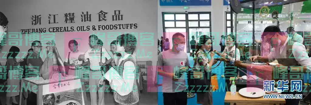 这是一张拼版照片:左图为1983年,港澳记者在了解金华火腿(新华社记者吴元柳摄);右图为2021年5月8日,在海南举行的首届中国国际消费品博览会高端食品保健品展区,观展者在品尝西班牙火腿(新华社记者金立旺摄)。新华社发