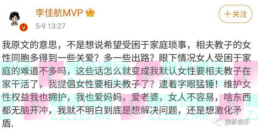 今天下午,李佳航再度发文:“这些话怎么就变成我默认女性要相夫教子在家干活了,我提倡女性要相夫教子了?逮着字眼猛锤!维护女性权益我也拥护……我就不明白到底是想解决问题,还是想激化矛盾。”