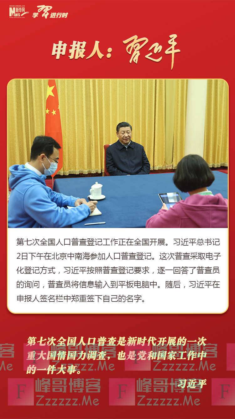 习近平在北京中南海参加全国人口普查登记,带头申报。他按照普查登记要求,逐一回答了普查员的询问,并在申报人签名栏中郑重签下自己的名字。