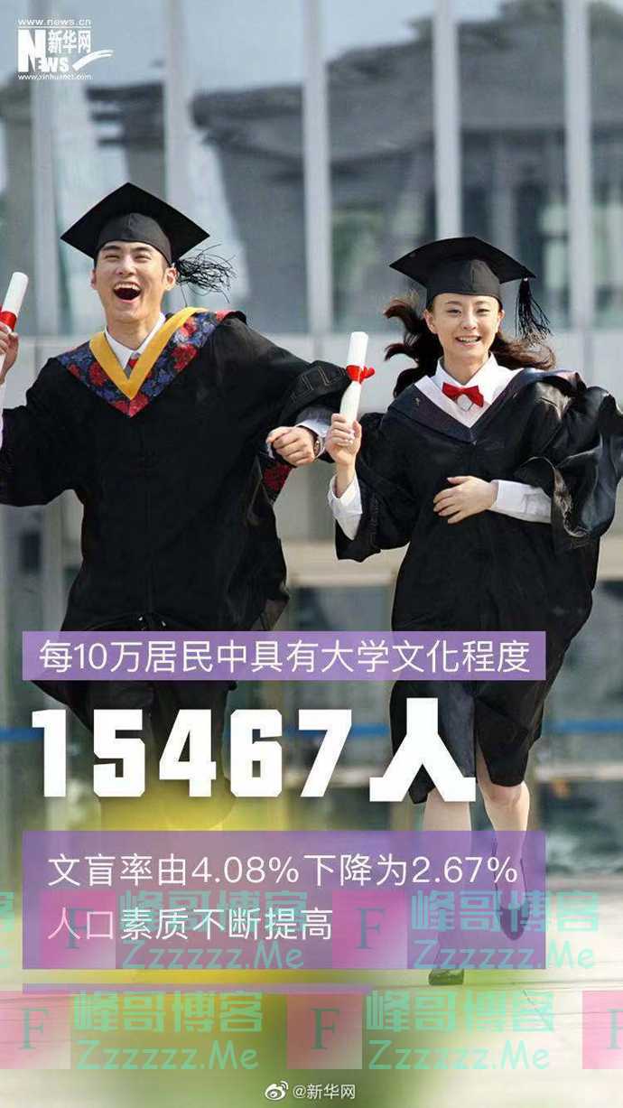第七次全国人口普查主要数据显示,我国具有大学文化程度的人口为21836万人,与2010年相比,每10万人中具有大学文化程度的由8930人上升为15467人,15岁及以上人口的平均受教育年限由9.08年提高至9.91年,文盲率由4.08%下降为2.67%。