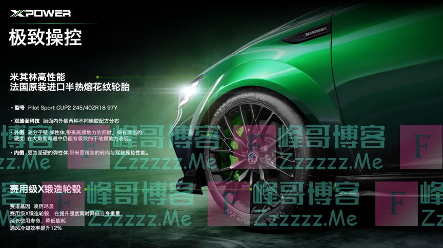 MG6 XPOWER搭载的赛用级6活塞XPOWER卡钳搭配赛用级刹车套装,成就百公里制动距离33米;法国原装进口的赛用级米其林高性能半热熔花纹轮胎,带来极致抓地表现力;赛用级X锻造轮毂,在提升强度同时降低自身重量,延长使用寿命,通风冷却效率提升12%,处处细节尽显赛道基因。