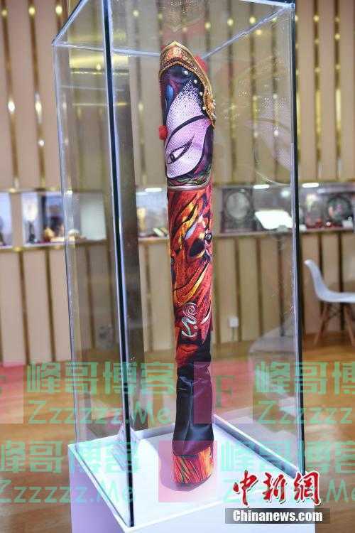 本文转自【中国新闻网】; 四川馆展示的川剧脸谱主题长靴。 中新社记者 崔楠 摄