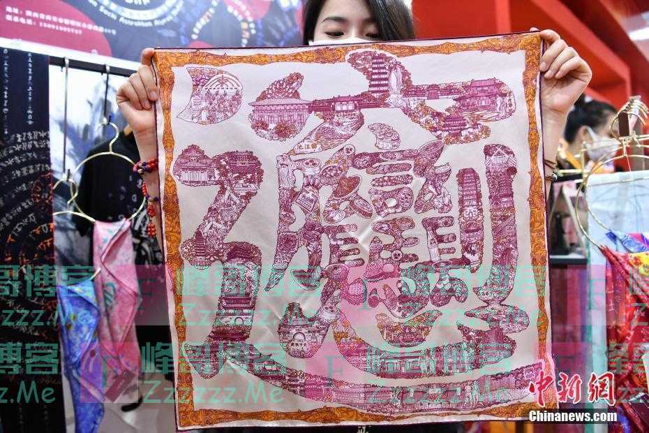 本文转自【中国新闻网】; 参展商在陕西馆展示以陕西美食“BiangBiang面”为灵感创作的主题文创丝巾。 中新社记者 崔楠 摄