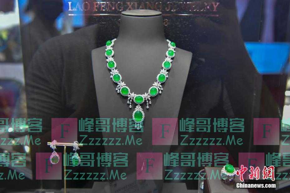 本文转自【中国新闻网】; 价值7788万元人民币的翡翠钻石项链、耳环、戒指套装在老凤祥展台展出。 中新社记者 骆云飞 摄