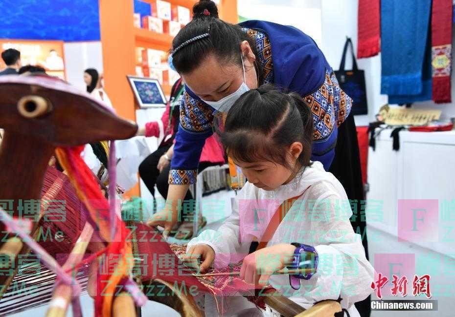 本文转自【中国新闻网】; 小朋友在湖南馆体验土家族传统织布技艺。 中新社记者 崔楠 摄