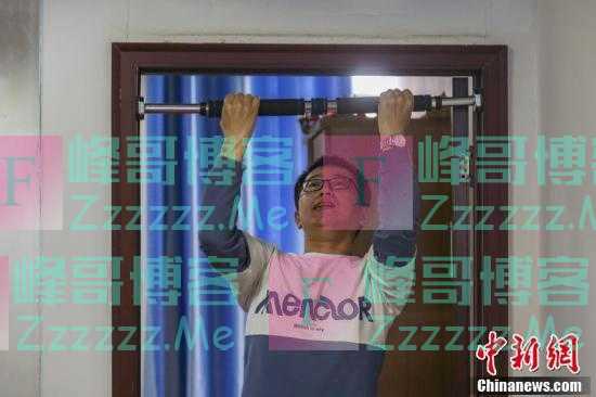 刘鑫在自己的工作室里做引体向上。