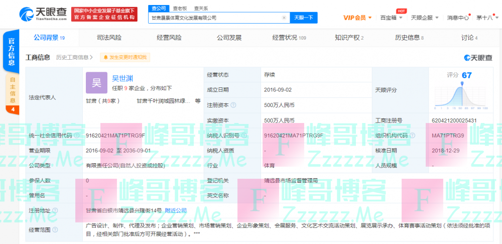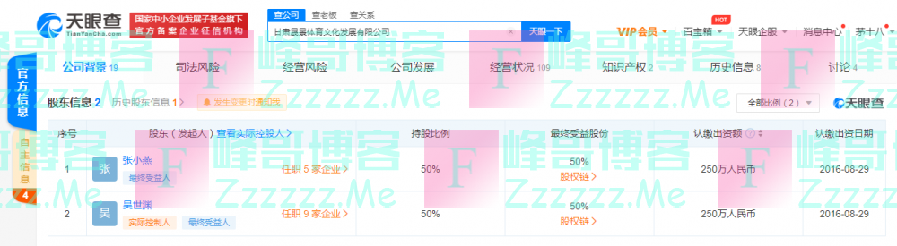 天眼查App显示,甘肃晟景体育文化发展有限公司成立于2016年9月,注册资本500万人民币,法定代表人为吴世渊,经营范围包括广告设计、制作、代理及发布;展览展示承办、体育赛事活动策划等。股东信息显示,该公司由张小燕、吴世渊共同持股,持股比例均为50%。