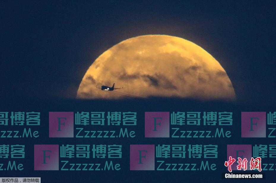 本文转自【中国新闻网】; 美国加州圣塔莫尼卡海滩,一架飞机和“超级血色月全食”同框。