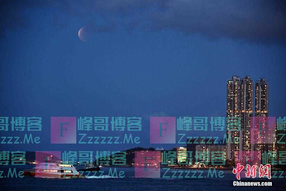 本文转自【中国新闻网】; 香港市民在黄埔海滨观赏“超级月全食” ,食甚期间月亮呈现暗红色,吸引大量市民前来欣赏。图为“超级满月”升至半空。 中新社记者 李志华 摄