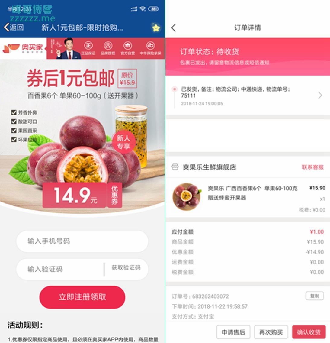 奥买家新人1元6个百香果包邮!》发布于2018-11-25