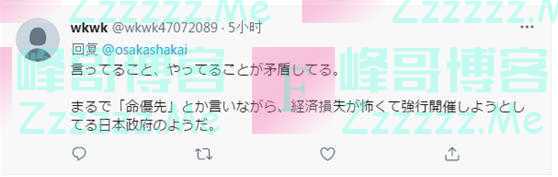 “朝日说的和做的是矛盾的。宛如嘴里说着‘生命(安全)最优先’,却害怕经济损失而强行举行(奥运会)的日本政府。”