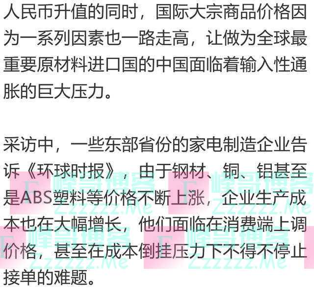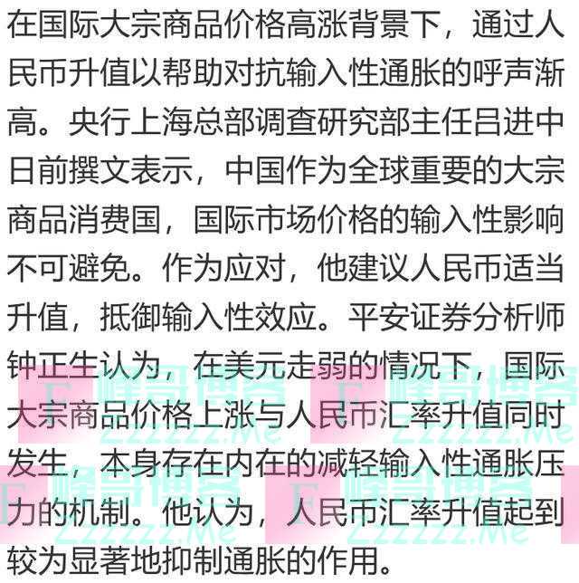 彭博社分析认为,这显示中国官方并不乐见市场升值预期急剧升温。彭博社认为,如果人民币短期升值幅度很大,对冲大宗商品涨价可能杯水车薪,却反而会伤及出口行业。升值预期陡增,还可能诱发企业恐慌性结汇和游资流入,给央行的宏观调节造成额外扰动。路透社也认为,中国监管层可能不乐见人民币升值预期继续强化,相较于大宗商品的涨幅,人民币升值缓解作用很有限,反而容易对出口造成影响。