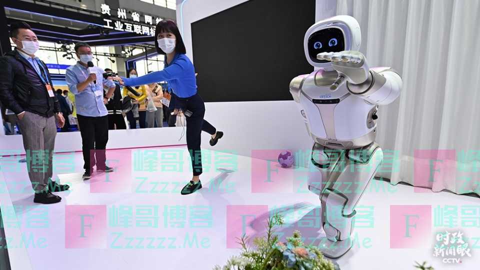 △2021年5月,贵阳,参会者在数博会上观看一款能浇花、递送饮料、踢球的智能机器人。(图/视觉中国)