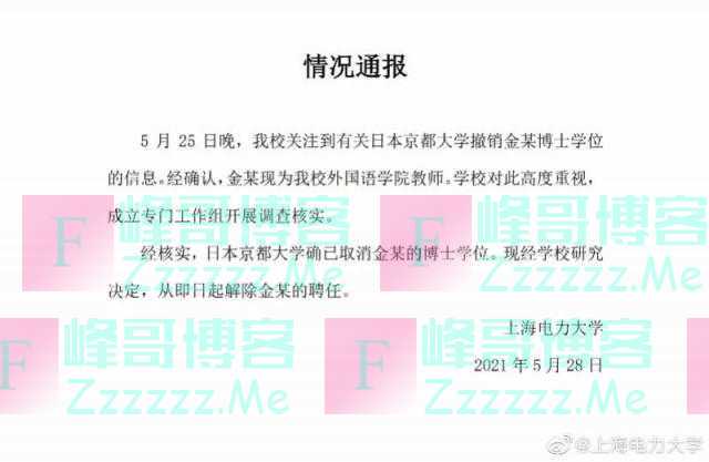 上海高校这名女教师,解聘!博士学位也丢了》发布于2021-5-30