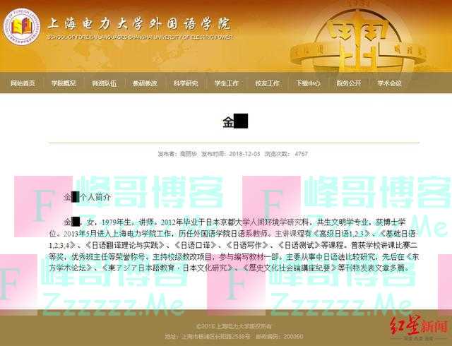 讲师金某为女性,2012年毕业于日本京都大学人间环境学研究科,共生文明学专业,获博士学位。于2013年5月进入上海电力学院工作,历任外国语学院日语系教师”。