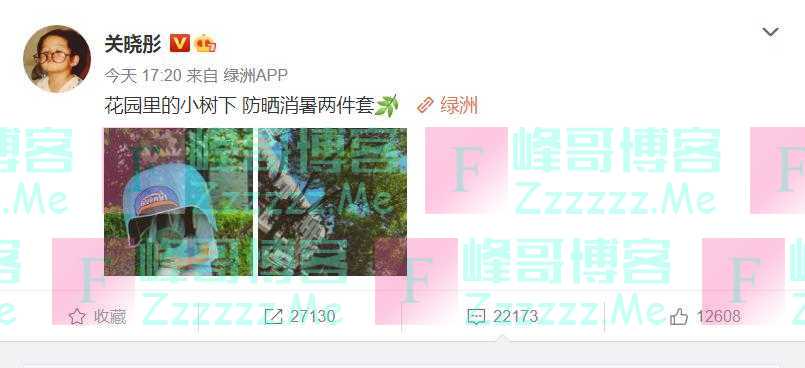 近日,关晓彤微博晒出自己打着看不到脸的太阳伞、吹着小风扇的照片,配文:“花园里的小树下 防晒消暑两件套”。