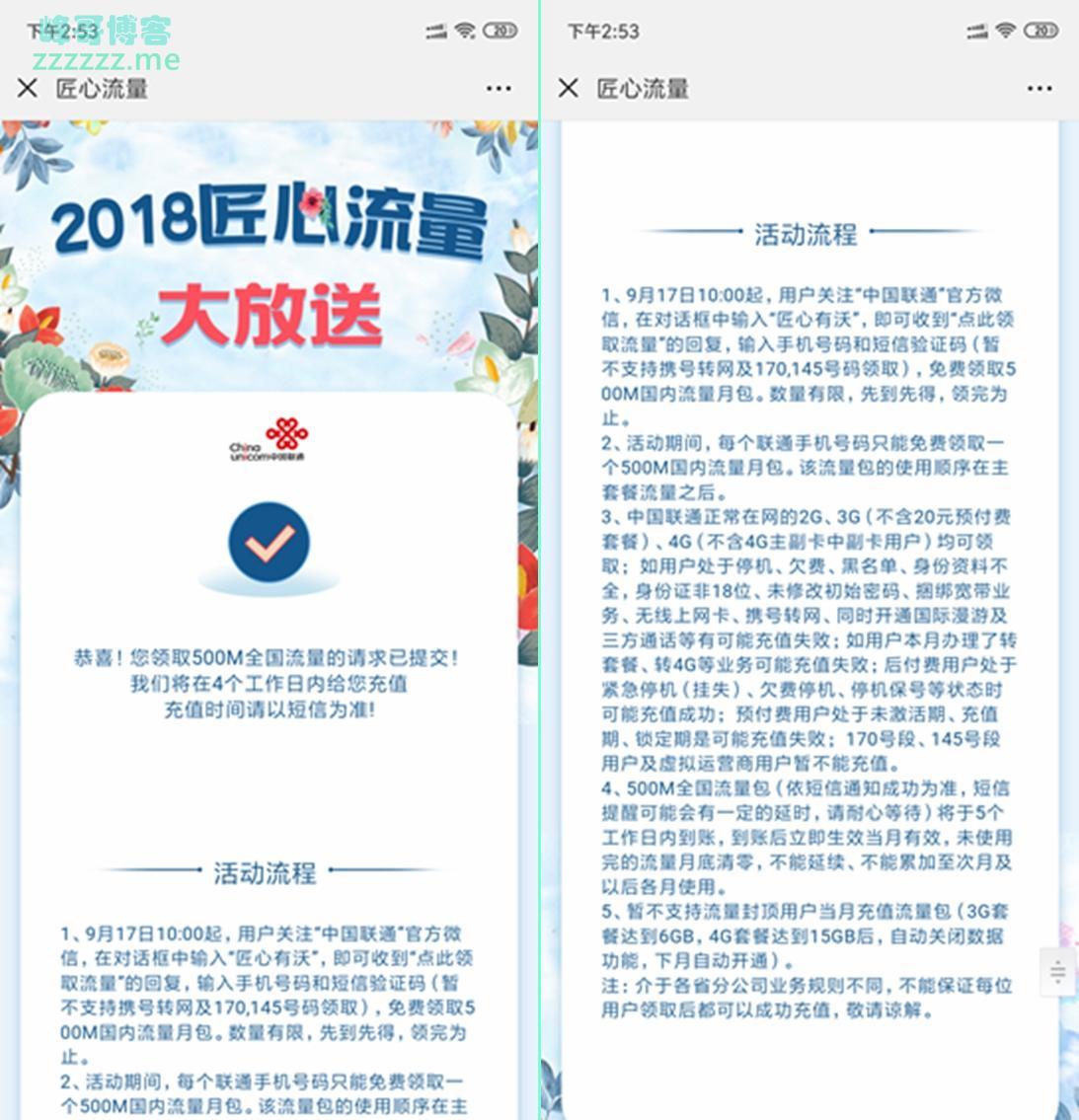 微信关注中国联通回复匠心有沃领500M全国流量12月到账!》发布于2018-11-26